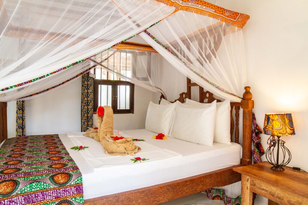 Hibiscus is a DOUBLE ROOM furnished with Zanzibarian antiques. It features a Zanzibarian style double bed made of coconut wood, a single Zanzibarian antique bed, a sitting area for two and a Zanzibarian teak cupboard. Find your restful sleep under the ceiling fan, protected by a mosquito net.